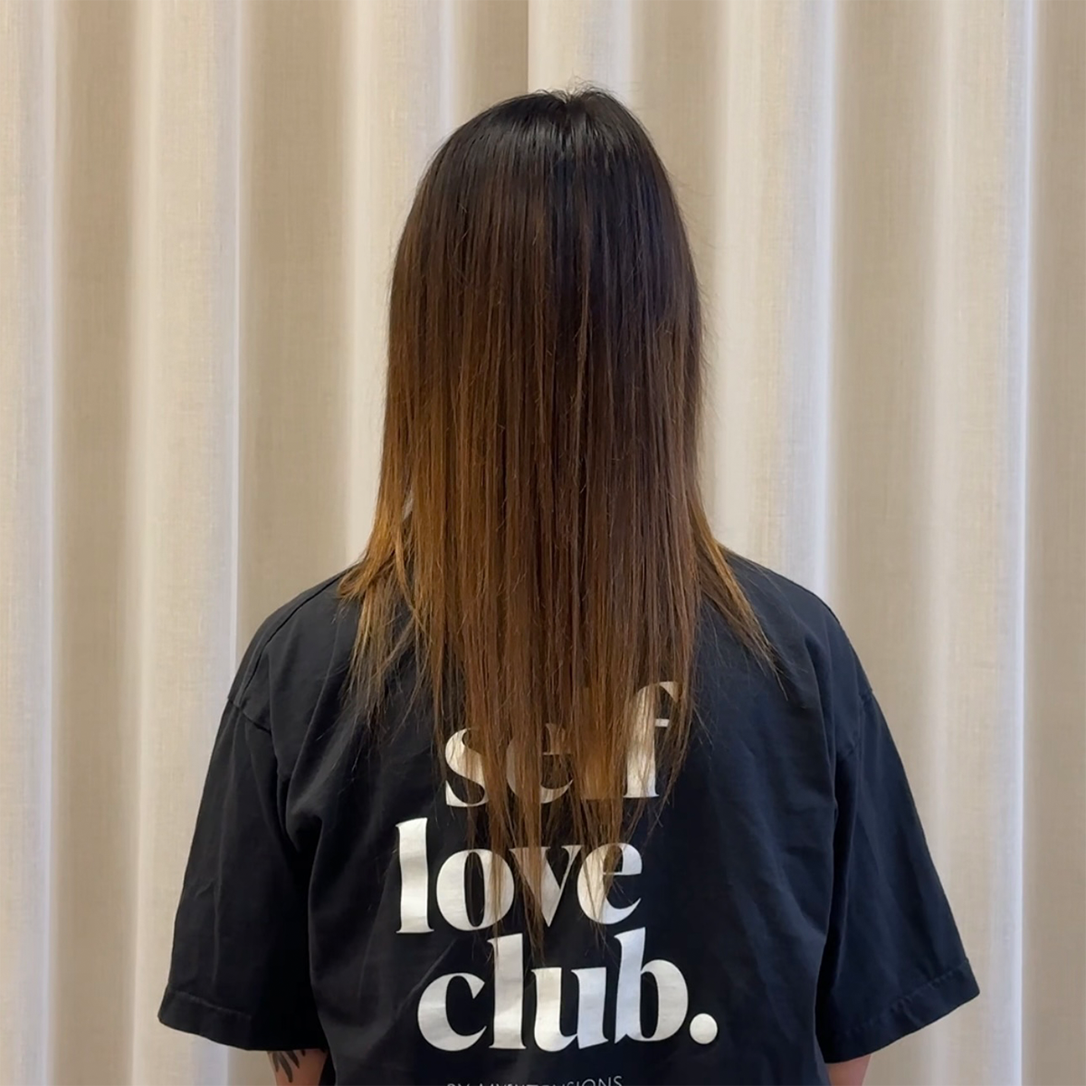 När du är klar med att sätta i hela din invisible tape weft kan du betrakta arbetet som gjort. Vi rekommenderar alltid en lätt trimning av dina extensions i topparna, men valet är naturligtvis ditt.