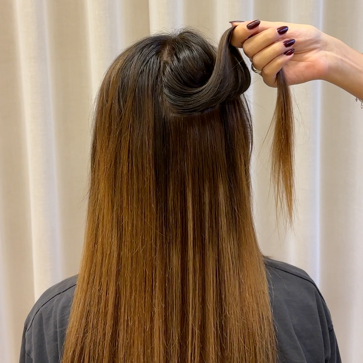 💡Tips: Invisible tape wefts kan antingen fästas med två remsor som en "sandwich" runt ditt eget hår, eller med ett enkel remsa fäst med single sided tape. Två lager runt håret ger mycket volym, medan ett lager ger ett mer platt och lätt resultat, perfekt för tunt hår.