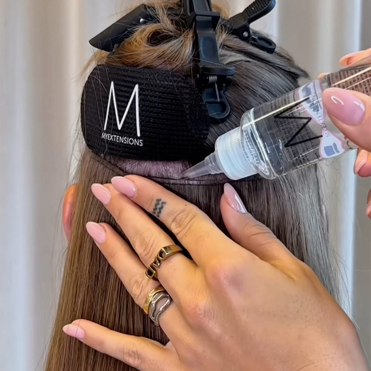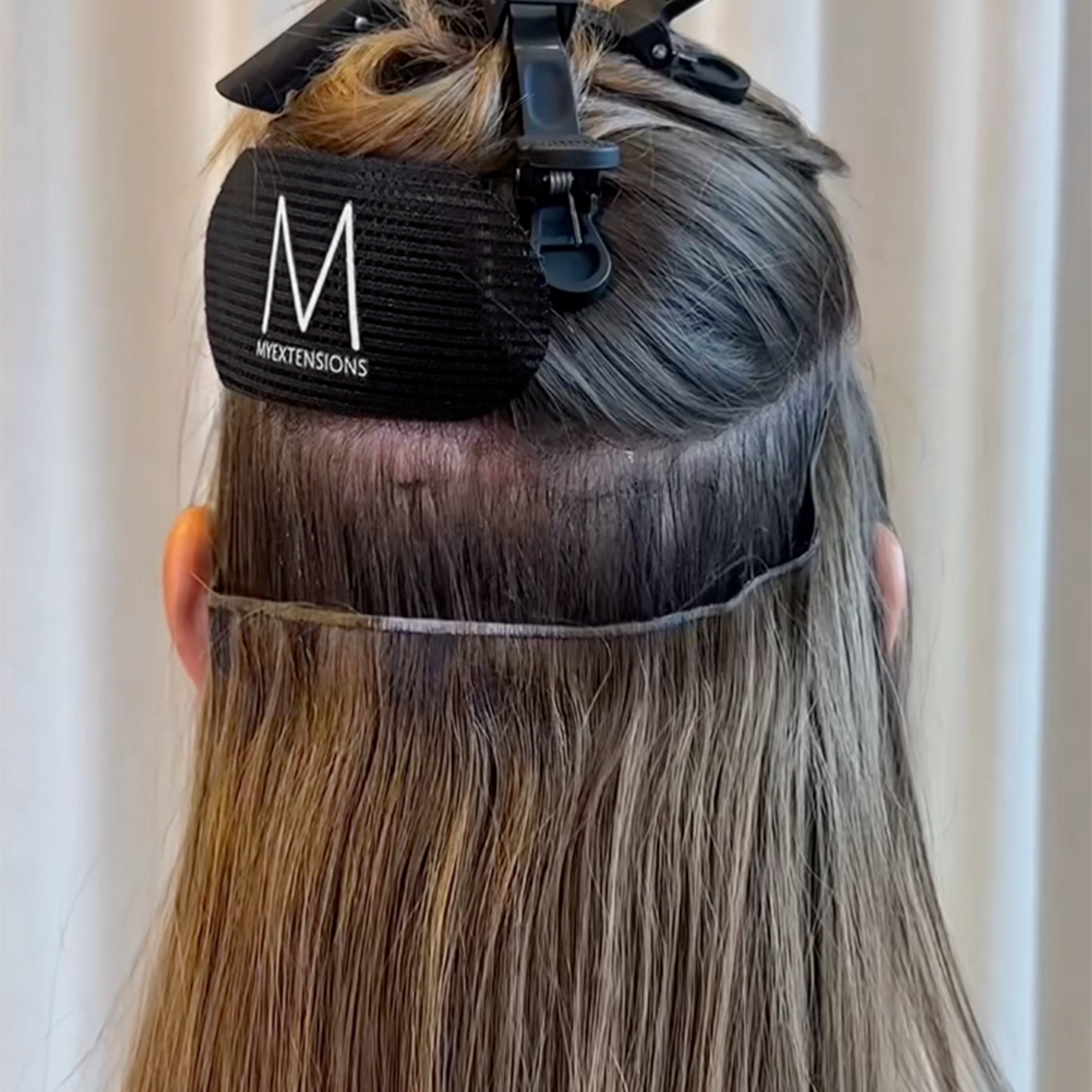 💡Viktigt: Undvik att röra tejpen under appliceringen, eftersom det kan skada dess vidhäftningsförmåga och orsaka att dina extensions glider ut.