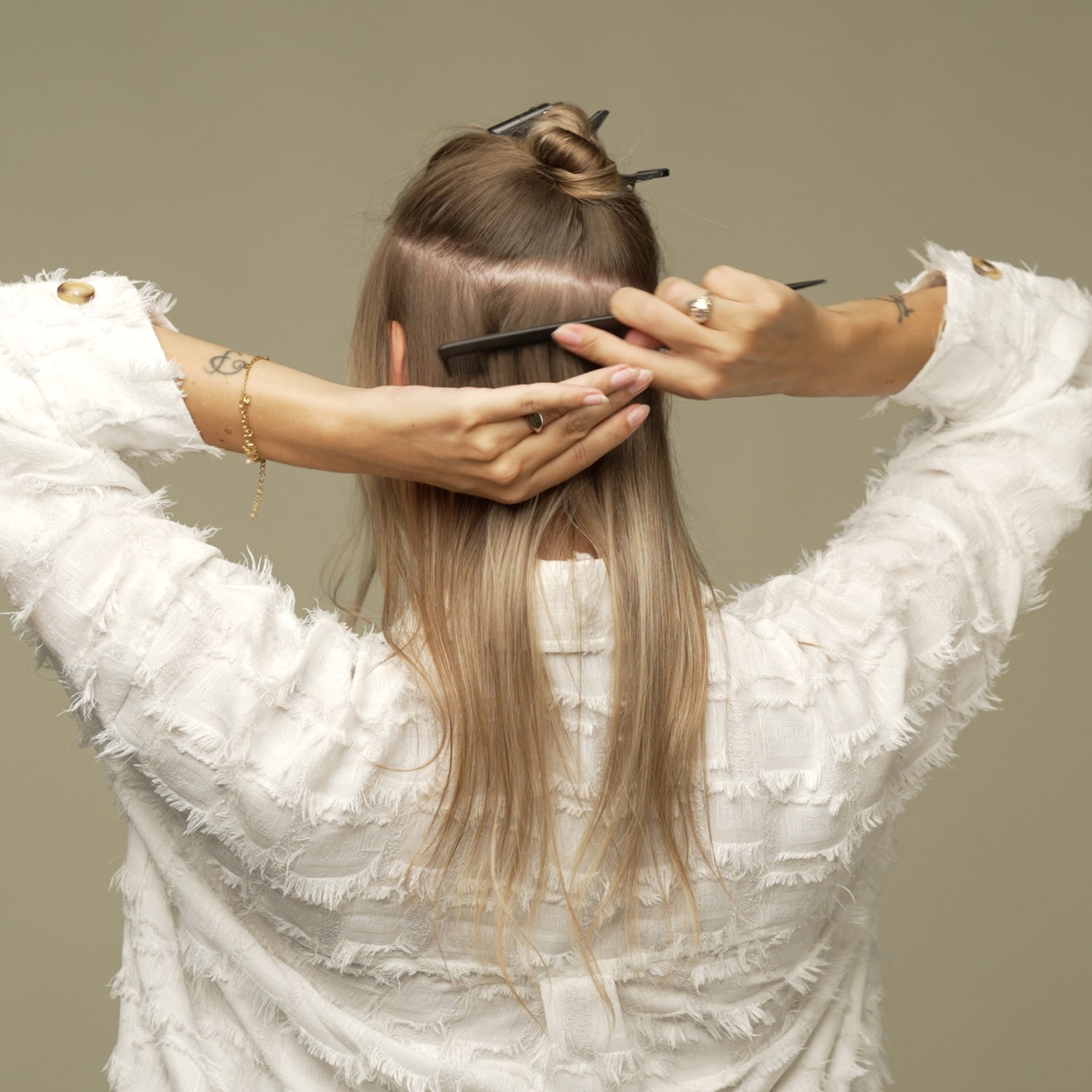 Innan du fäster dina halo extensions med clips är det klokt att lätt tupera håret vid rötterna. Det är en särskilt bra idé om du har rakt eller fint hår – då har dina clips något att fästa i.