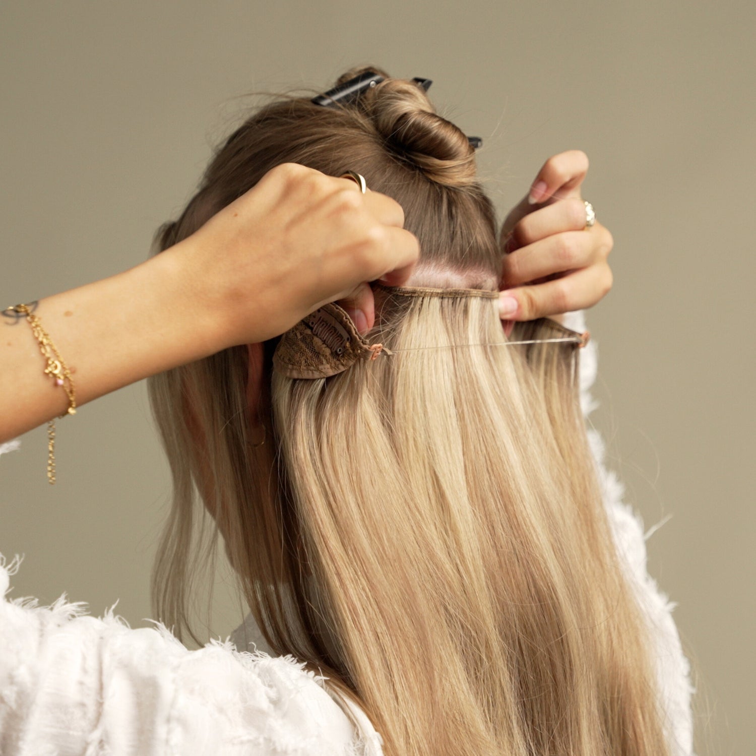 Placera dina halo extensions längs benan och fäst de tre mittersta clipsen i ditt eget hår. De två clipsen som sitter i sidorna ska fästas senare.